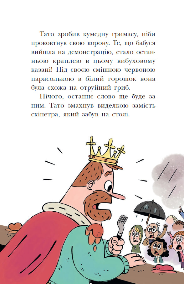 - Яскраві та кумедні ілюстрації, що доповнюють атмосферу королівського хаосу