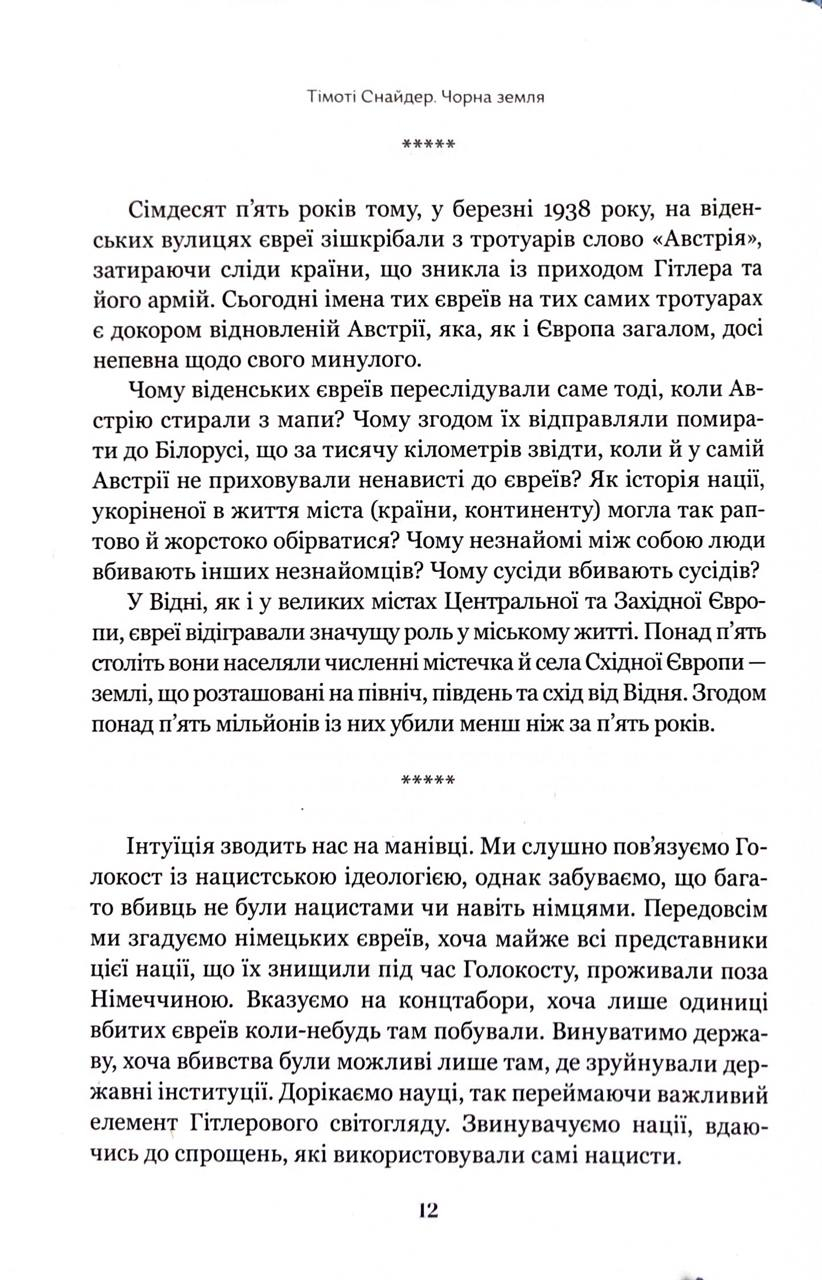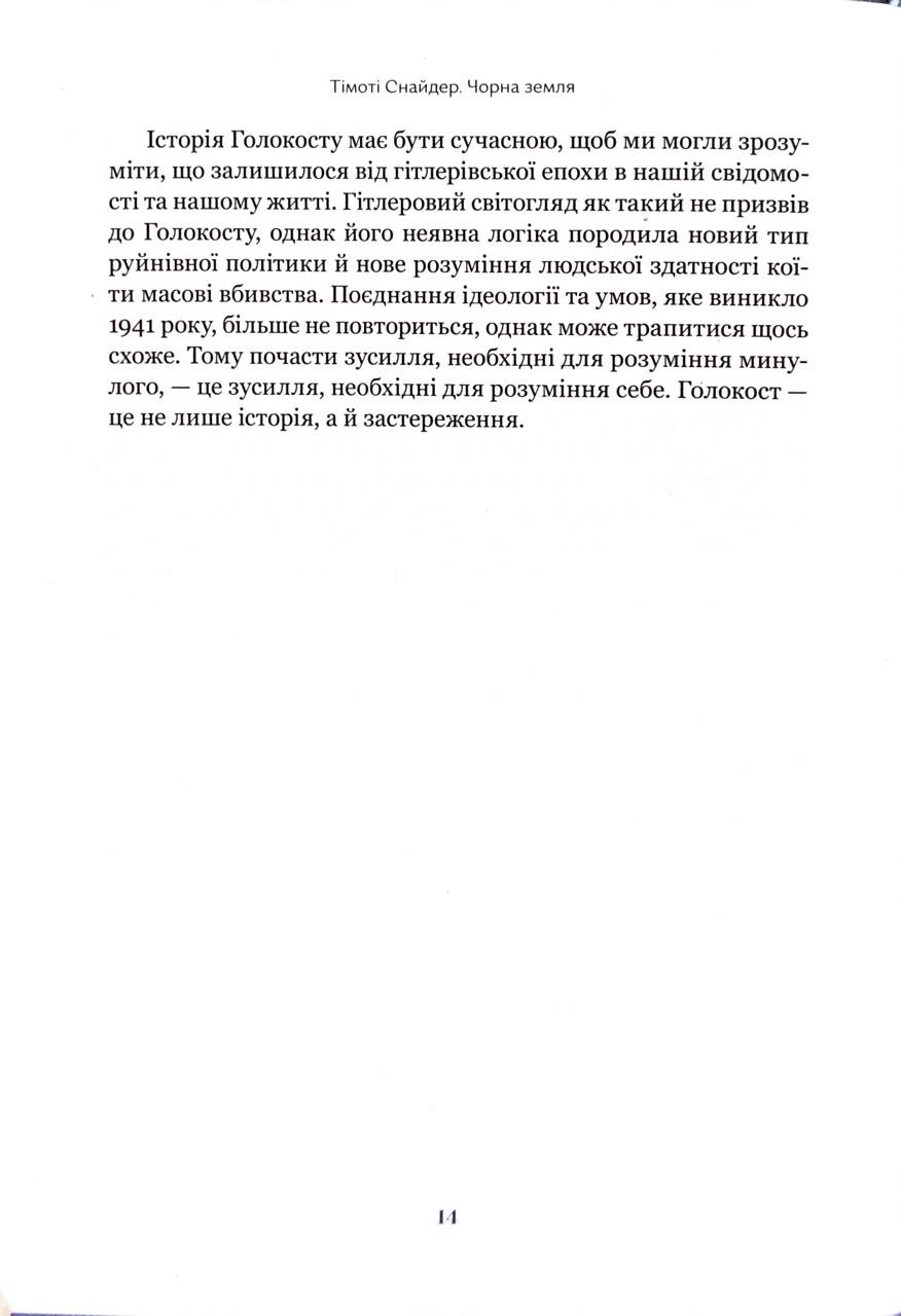 Чорна земля. Голокост як історія і застереження — це одна з найважливіших праць професора Тімоті Снайдера, яка пропонує радикально новий погляд на трагедію Голокосту. Спираючись на унікальні джерела зі Східної Європи та свідчення тих, хто вижив, автор доводить: Голокост не був випадковим сплеском безумства, а став результатом цілеспрямованого знищення державних інституцій. Це книга про те, як крихкість світового порядку може призвести до катастрофи, і чому уроки минулого є критично важливими для нашого майбутнього.