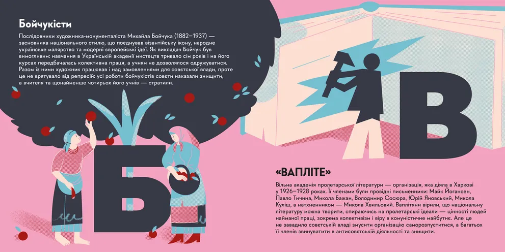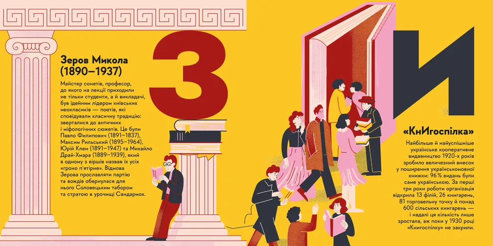 Привіт! Я — книжечка про покоління митців, чиї голоси мали б лунати з екранів телевізора чи зі сцени театрів. На чиї вистави й поетичні читання мали б приходити сотні шанувальників. Але совєти заборонили їхню творчість, змусили їх мовчати, а нас — на довгі роки забути про безліч українських талантів. Мої автори шукали їхні історії в архівах, перебирали старі світлини й читали рукописи, аби створити абетку про українське Розстріляне відродження. Кожна літера цієї книжки — спроба повернути голос тим, у кого його відібрали. Мене створили для спільного читання батьків і дітей, аби разом відкривати складні сторінки української історії. Якщо хочеш дізнатися більше про рідну країну — збирай інші «Книжечки-мандрівочки» та подорожуй разом із нами.