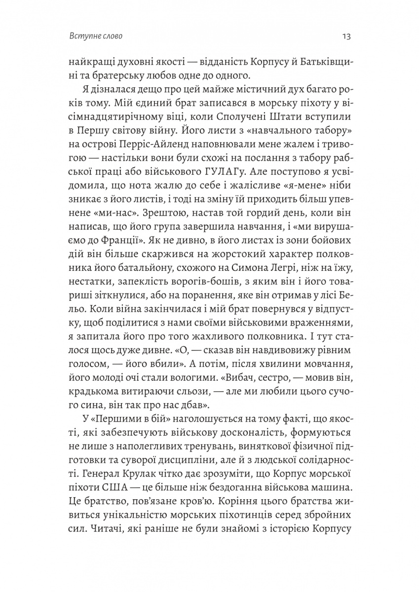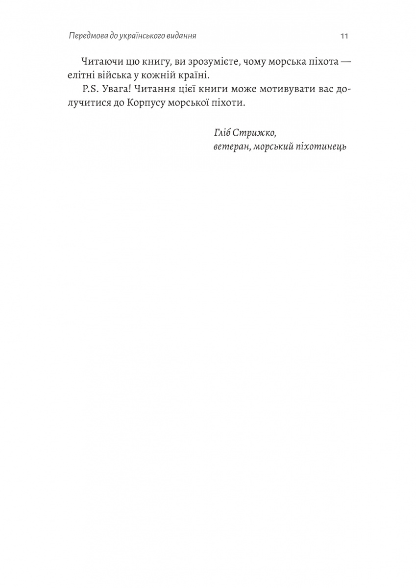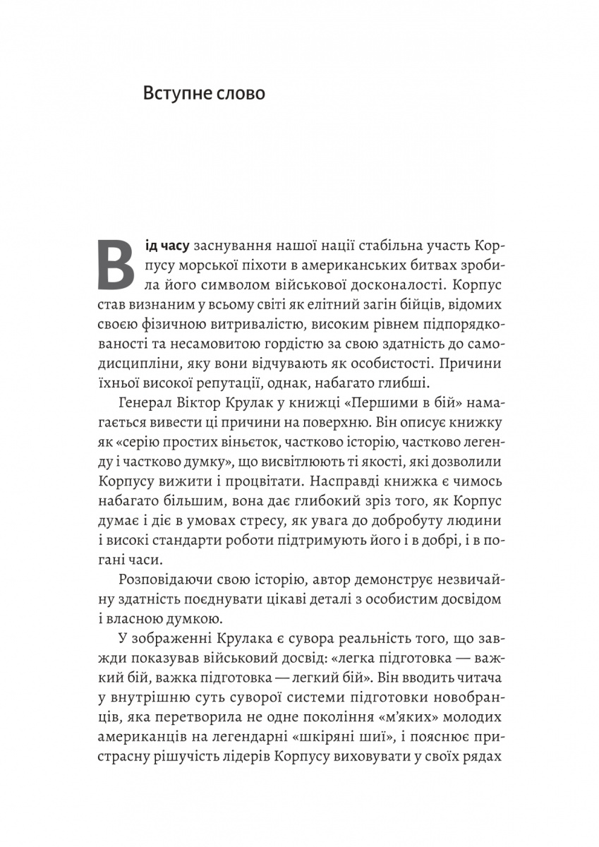 Генерал Віктор Г. Крулак, вміло поєднуючи історію з автобіографією та дію з аналізом, відокремлюючи факти від вигадок, торкається самої суті Корпусу морської піхоти — що означає бути морським піхотинцем? Що стоїть за його репутацією і як йому вдається виживати і навіть процвітати, попри непереборні політичні перешкоди та «надзвичайну схильність стріляти собі в ногу»?