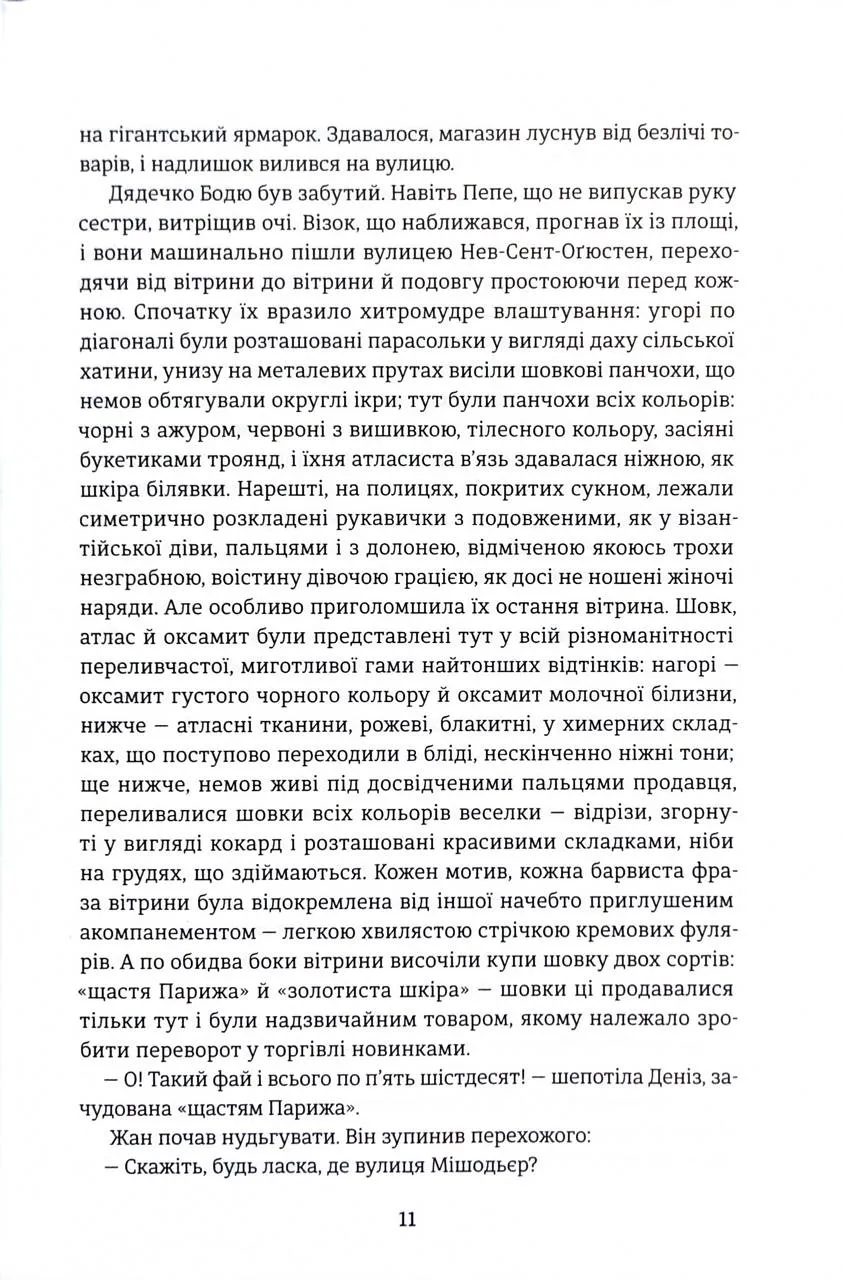 - Атмосферність: автор майстерно змальовує Париж — від брудних завулків старих кварталів до розкішних залів, де панує азарт покупок.