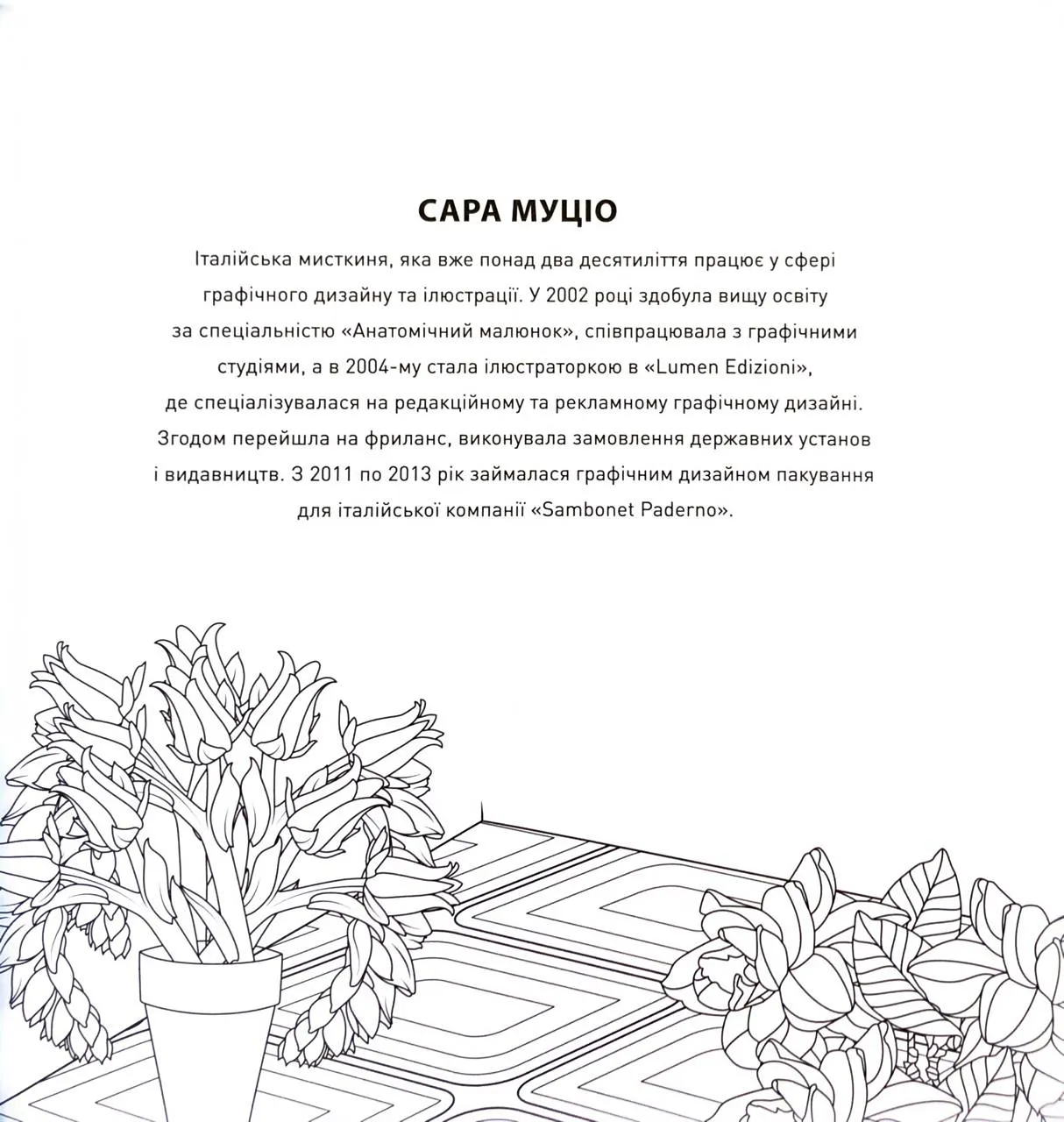 Книга Міські джунглі авторства Сари Муціо — це не просто збірка ілюстрацій для розфарбовування, а справжнє занурення в один із найпопулярніших інтер'єрних трендів сучасності. Відома італійська художниця пропонує відкласти щоденні турботи та відчути себе дизайнером, який перетворює холодний бетон на живий, зелений простір.