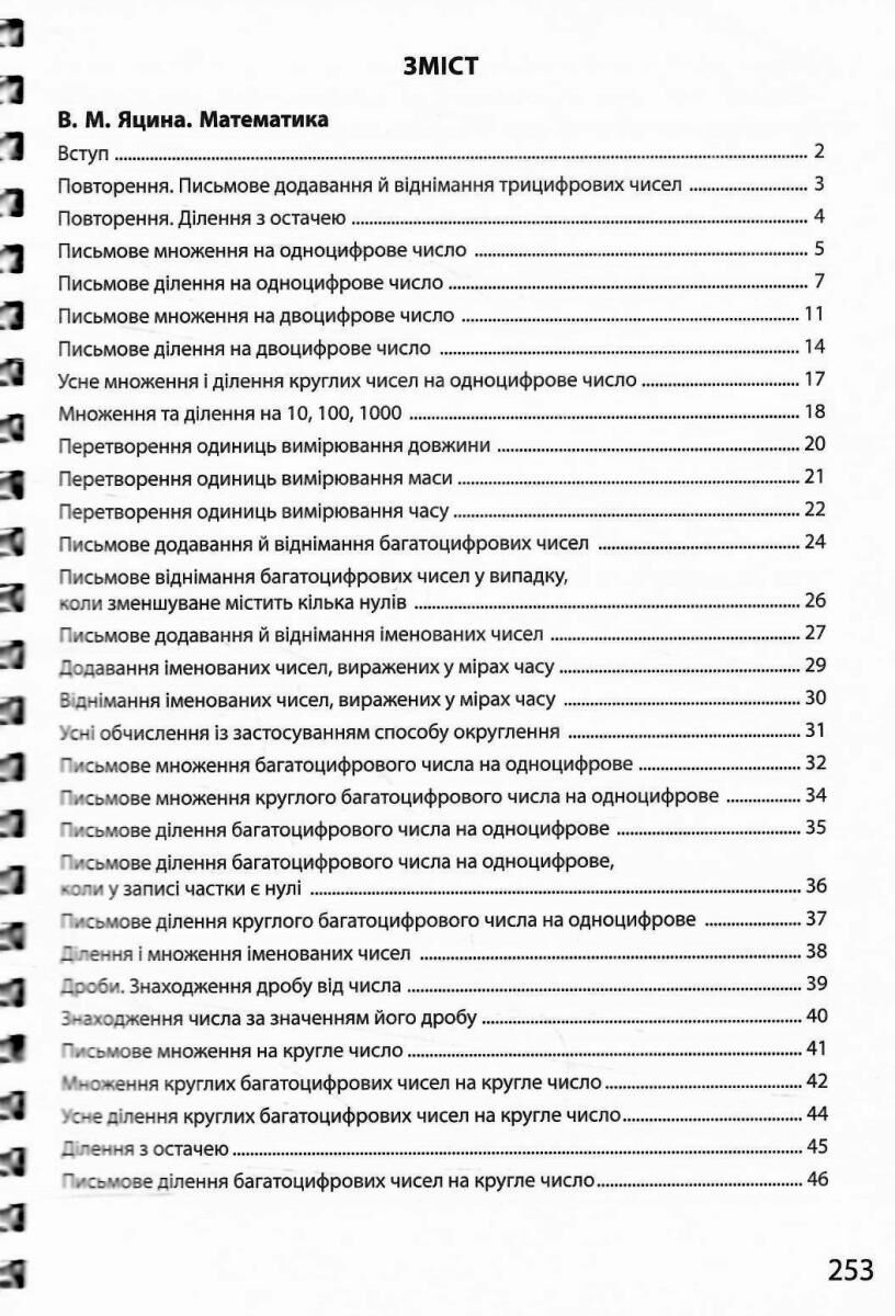 - Математика: робота з багатоцифровими числами, перетворення складних одиниць вимірювання, множення та ділення у стовпчик, ділення з остачею, вивчення дробів та розв'язування багатоступеневих задач.