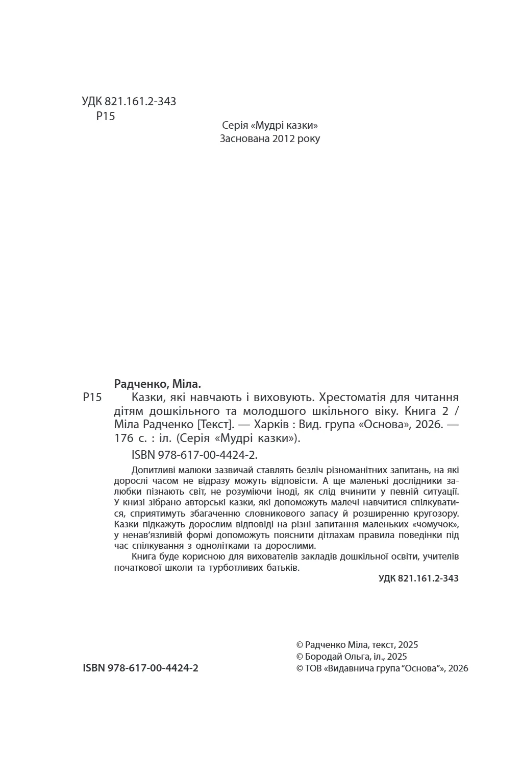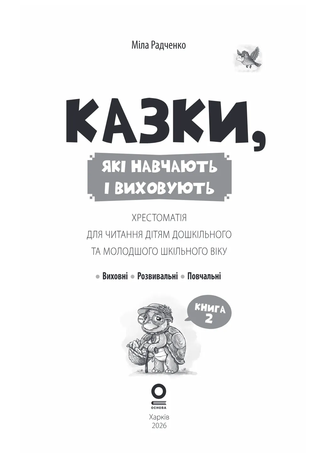 Казки, які навчають і виховують. Кристоматія для читання дітям. Книга 2 — це незамінний помічник для батьків та вихователів. Авторки Міла Радченко та Ольга Бородай створили збірку, яка допомагає знайти правильні слова для пояснення складних понять. Через мову казок дитина легко засвоює важливі життєві цінності, вчиться розрізняти добро і зло та формує корисні звички.
