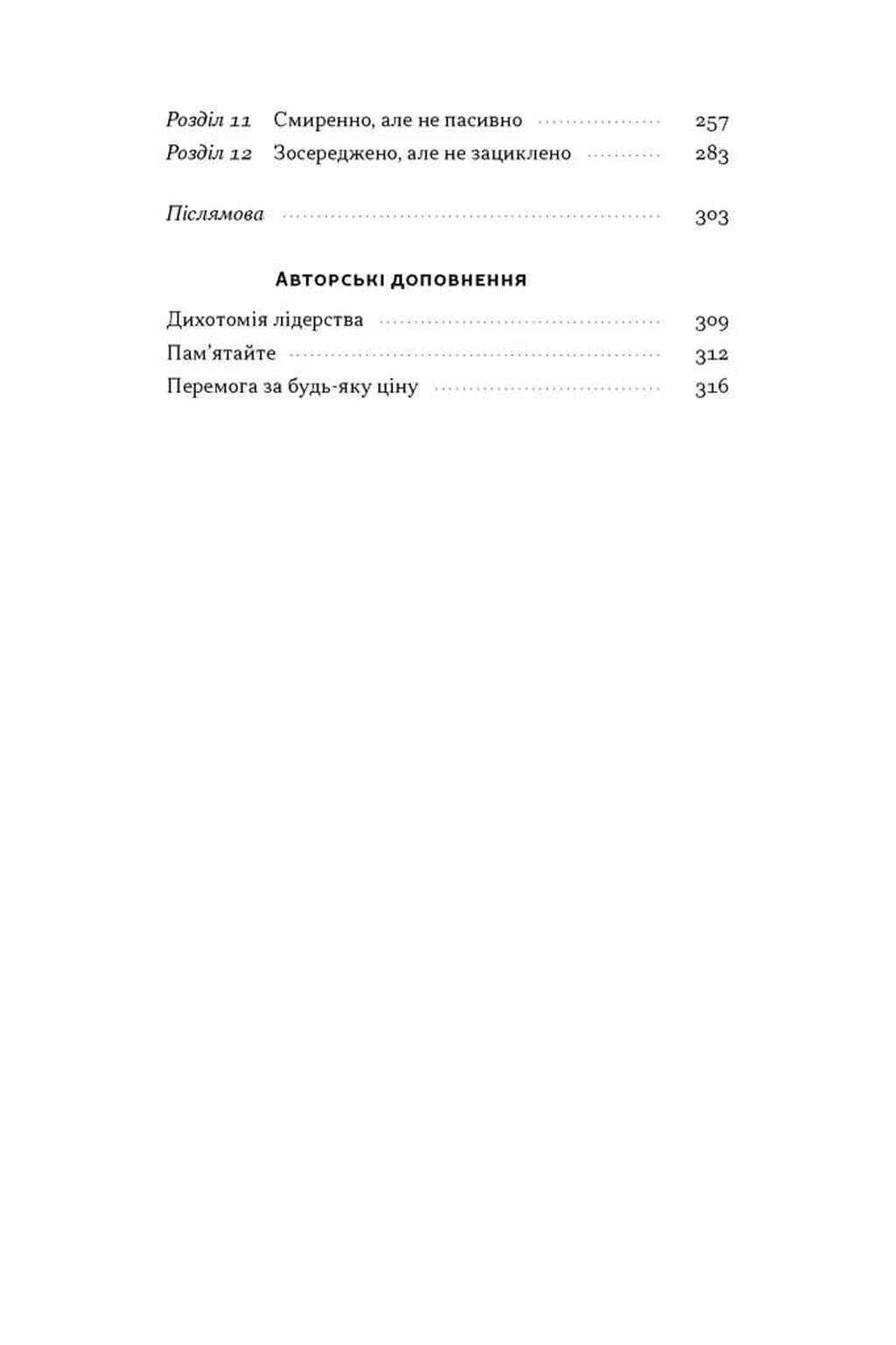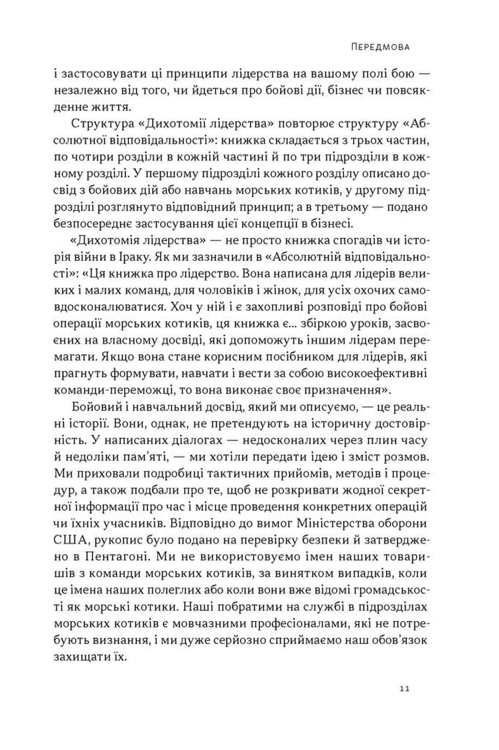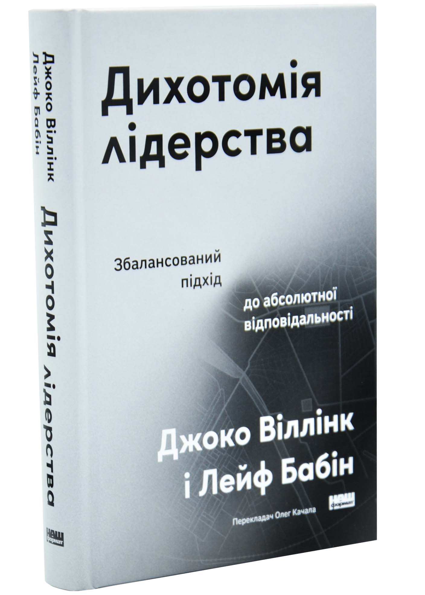 Дихотомія лідерства — це потужне продовження світового феномена «Абсолютна відповідальність». Автори книги, Джоко Віллінк та Лейф Бабін, колишні офіцери підрозділу Navy SEAL, переносять жорсткий досвід бойових дій у Рамаді на поле бізнесу та особистого життя. Це видання для тих, хто вже зрозумів, що таке відповідальність, і тепер прагне опанувати найскладніший рівень — пошук ідеального балансу в управлінні людьми.