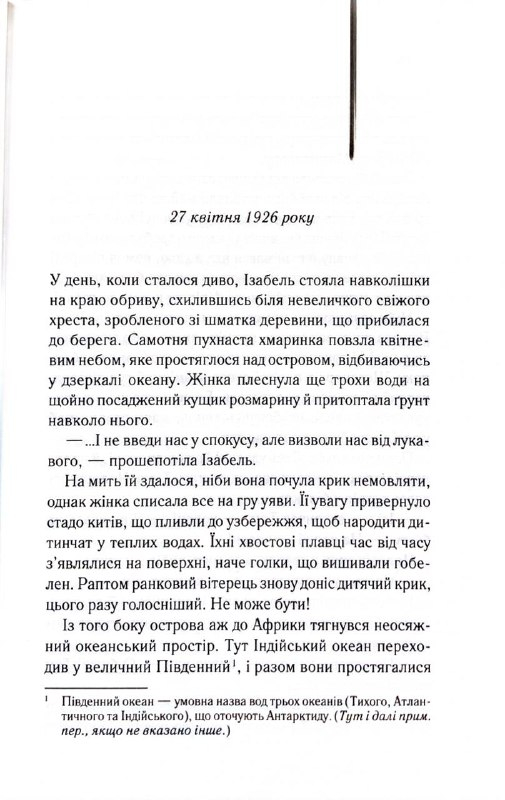 Світло між двох океанів — це дебютний роман австралійської письменниці М. Л. Стедман, який став справжньою світовою сенсацією та ліг в основу однойменної голлівудської екранізації. Історія розгортається на віддаленому острові-маяку Янус-рок, де серед дикої природи та двох океанів молодий ветеран Том Шерборн шукає спокою після жахів війни. Але коли море приносить до їхнього берега дитину, тихе щастя Тома та його дружини Ізабель перетворюється на складну етичну пастку. Це книга, яка змушує читача запитати себе: що є правильним, коли на терезах стоїть людське щастя та істина?