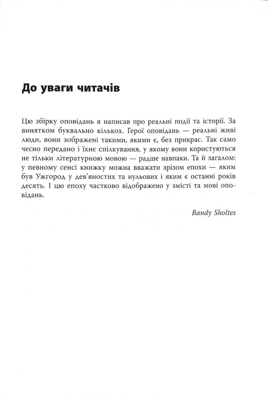 Ужгородські історії — це не просто збірка оповідань, це портал у паралельний всесвіт найтеплішого міста України, де реальність межує з абсурдом, а буденність перетворюється на вишуканий анекдот. Банді Шолтес (Bandy Sholtes) майстерно фіксує життя таким, як воно є: з його «нічною логікою», наслідками крадіжки німецького пальта та філософськими роздумами таксистів. Кожна історія базується на реальних подіях, що робить їх до болю знайомими та водночас неймовірно екзотичними для тих, хто ніколи не пив кави на ужгородській набережній. Це книга для тих, хто цінує чесність без прикрас, гострий розум та вміння сміятися над власними біографічними курйозами.