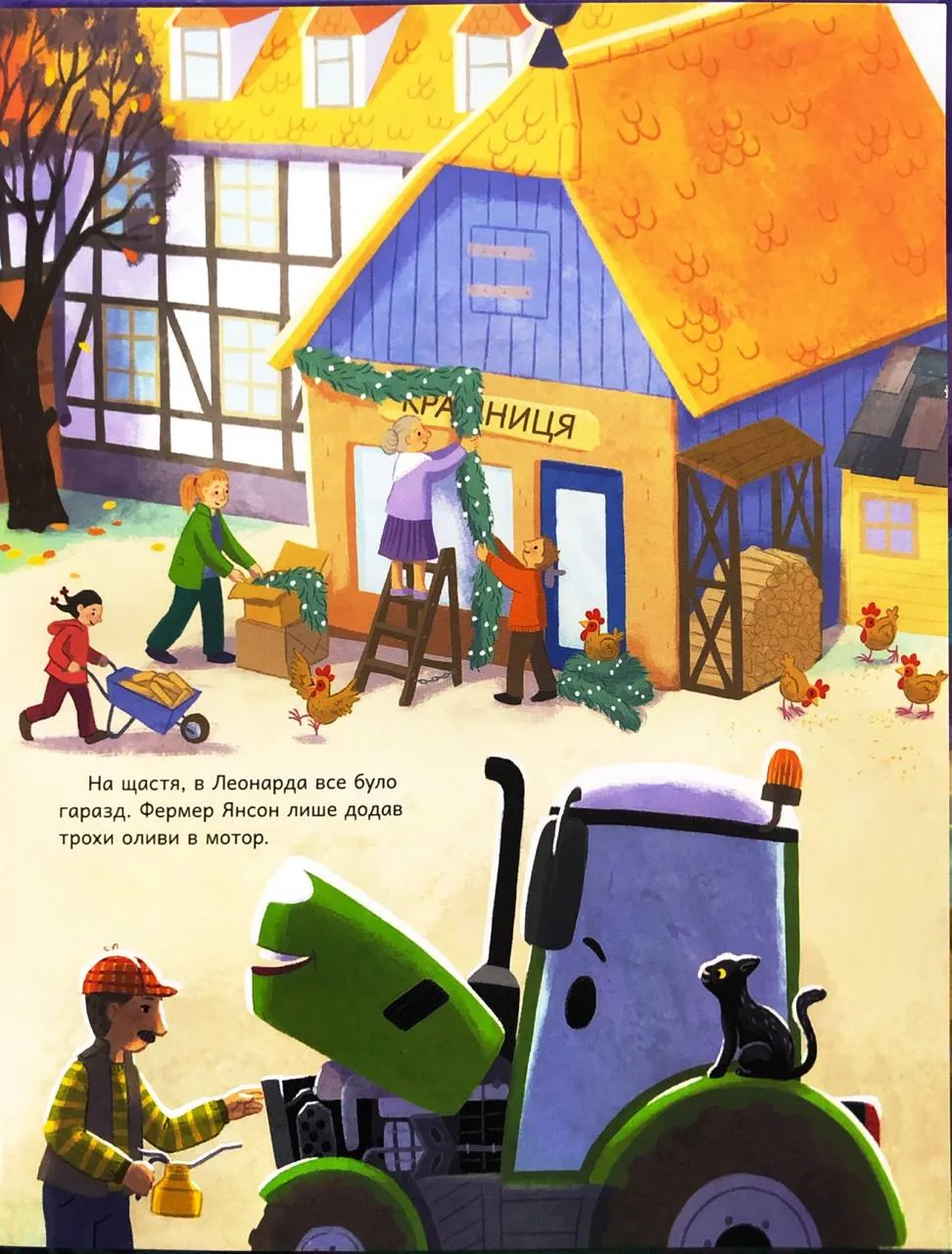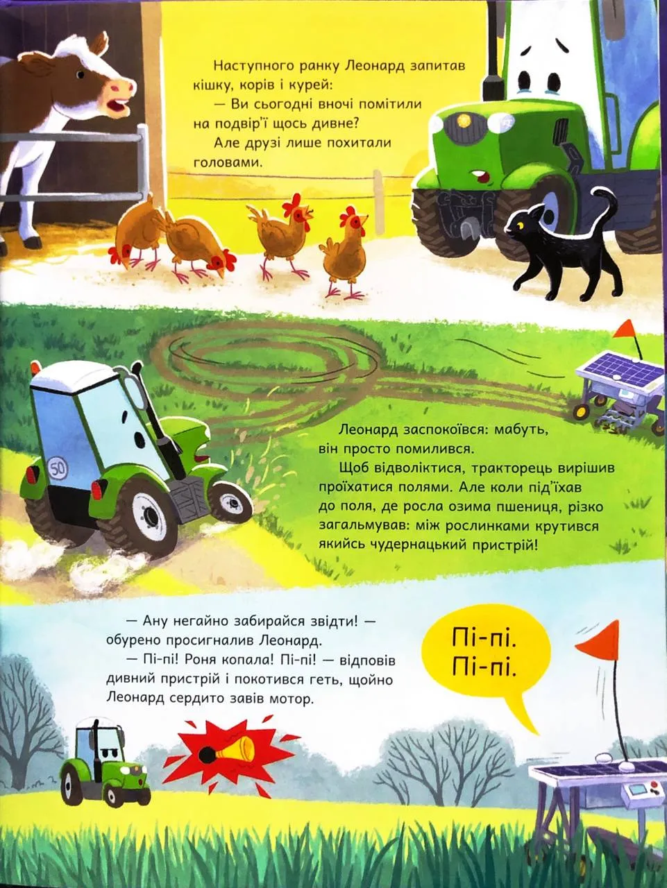 Трактор Леонард освітлює темряву — це нове яскраве оповідання від популярної німецької авторки Сузи Кольб, яке занурює маленьких читачів у загадкову пригоду на фермі родини Янсонів. Усе почалося з дивного шуму вночі, який розбудив Леонарда в його затишному ангарі. А вже наступного ранку тракторець виявив незрозумілі сліди прямо посеред своєї золотої пшениці! Хто цей таємничий гість, що шкодить на полях? Не гаючи часу, відважний Леонард вирушає в бурхливу гонитву, щоб захистити ферму. Те, що спершу здавалося загрозою, виявляється знайомством із маленьким польовим роботом. Ця історія вчить дітей, що нові знайомства збагачують наше життя, а сучасні технології можуть стати чудовими напарниками в спільній роботі.