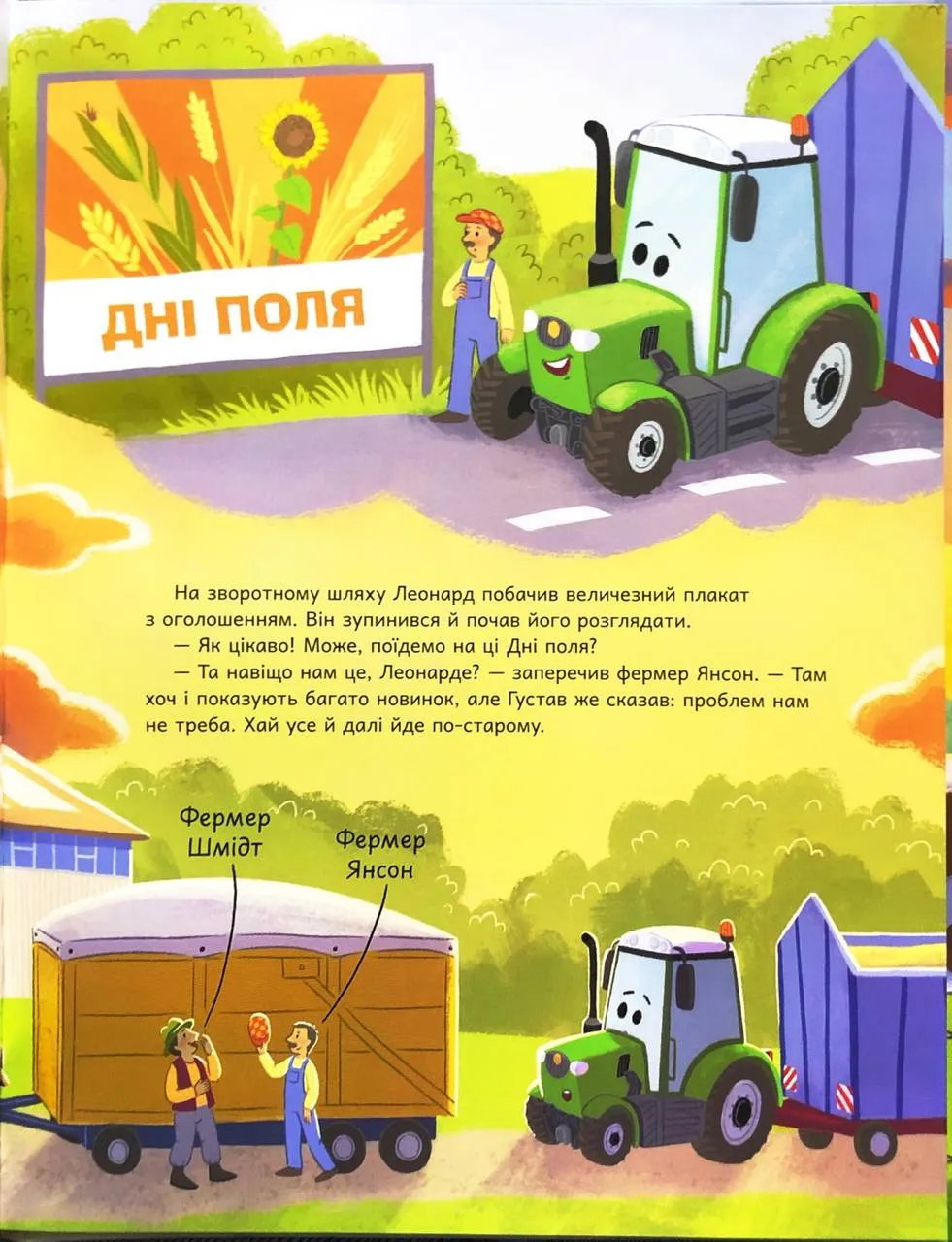 Трактор Леонард задумав сюрприз — це захопливе продовження пригод улюбленого героя від німецької авторки Сузи Кольб. Цього разу на фермі родини Янсонів панує легка розгубленість: фермер помічає, що всі навколо вирощують однакові продукти, і крамниці переповнені зерном. Потрібні зміни, але Янсон не наважується на ризик. Тоді за справу береться відважний Леонард! Потайки від усіх він вирушає на грандіозну виставку «Дні поля», щоб знайти нові ідеї для своєї ферми. Попереду на нього чекає велика гра з таємним полем, підтримка вірних друзів-машин та допомога кмітливих тварин. Це історія про те, що кожен із нас має особливі сили, а щире бажання допомогти здатне змінити життя цілої родини на краще.