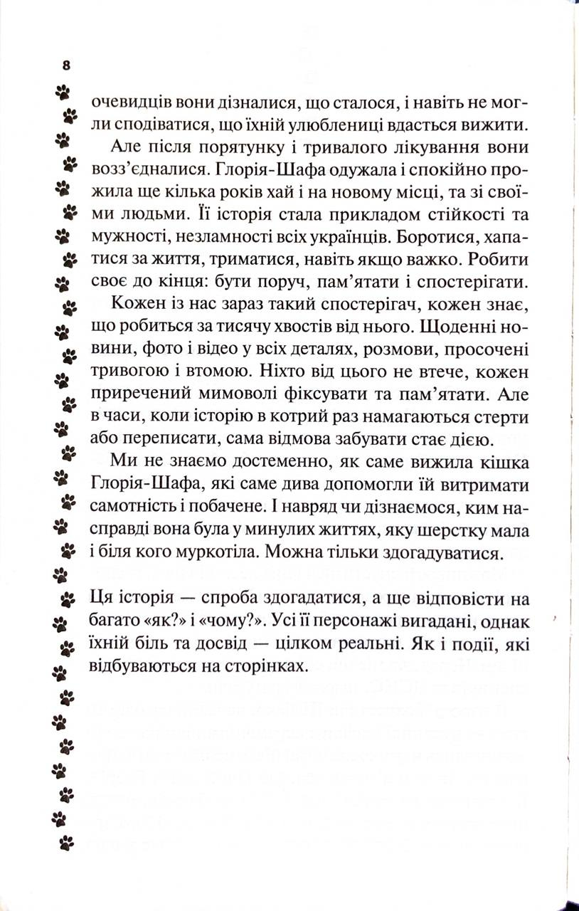 9 життів кішки Шафи — це надзвичайно емоційна та символічна повість Руслани Фалько, яка бере свій початок у реальних кадрах сучасної української трагедії та перетворюється на величну сагу про незнищенність життя. Головна героїня, руда кішка Глорія, прокидається посеред руїн свого дому, де замість стін — пил, а замість підлоги — безкрає провалля. Поки внизу гуркочуть «залізні звірі», Глорія занурюється у глибини своєї пам'яті. Виявляється, це не перша її битва. У своїх минулих життях вона була свідком козацької звитяги поруч із Тадеєм, бачила шляхетний побут панни Орисі та навіть допомагала повстанцям у криївках. Змінювалися епохи, імена та обставини, але ворог лишався тим самим. Це історія про те, що справжній дім — це не стіни, а люди, до яких кішка повертається знову і знову, крізь віки та випробування.