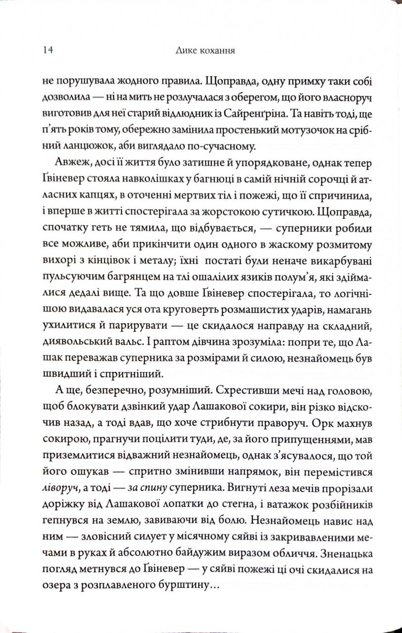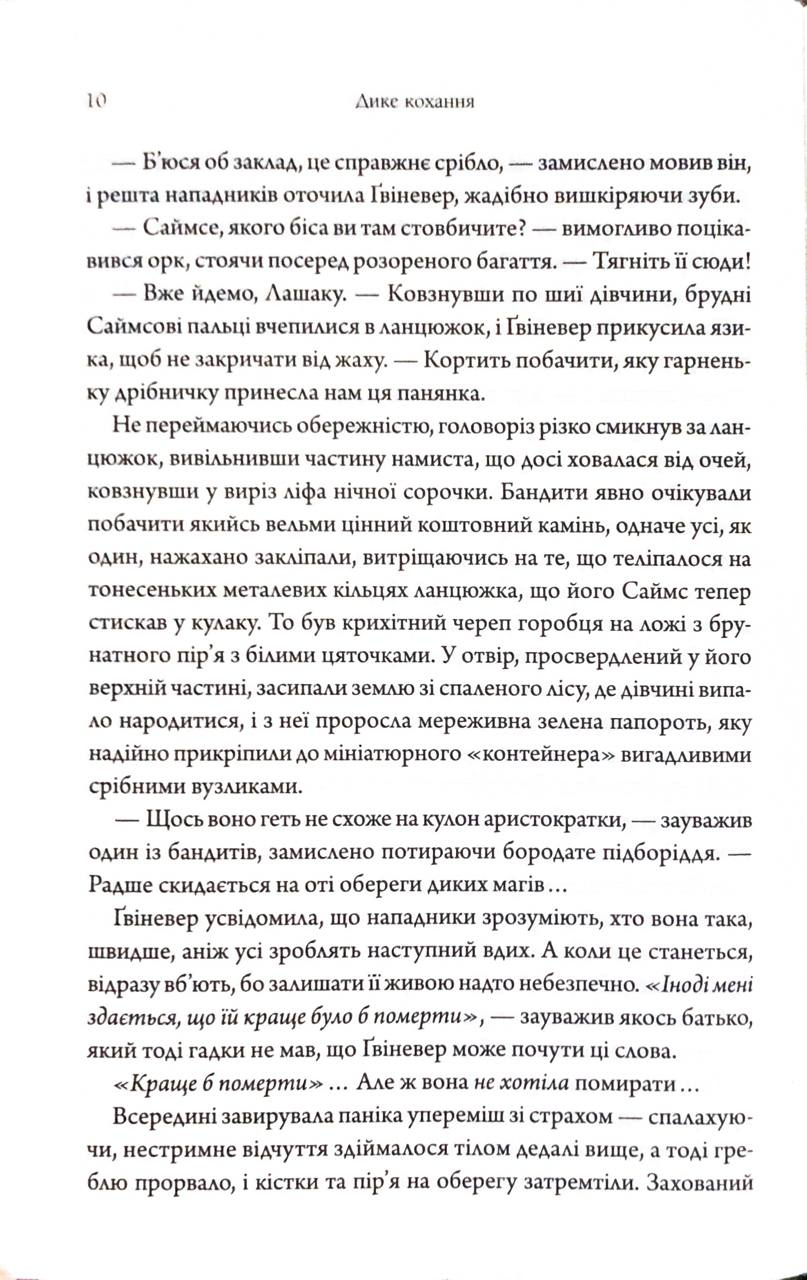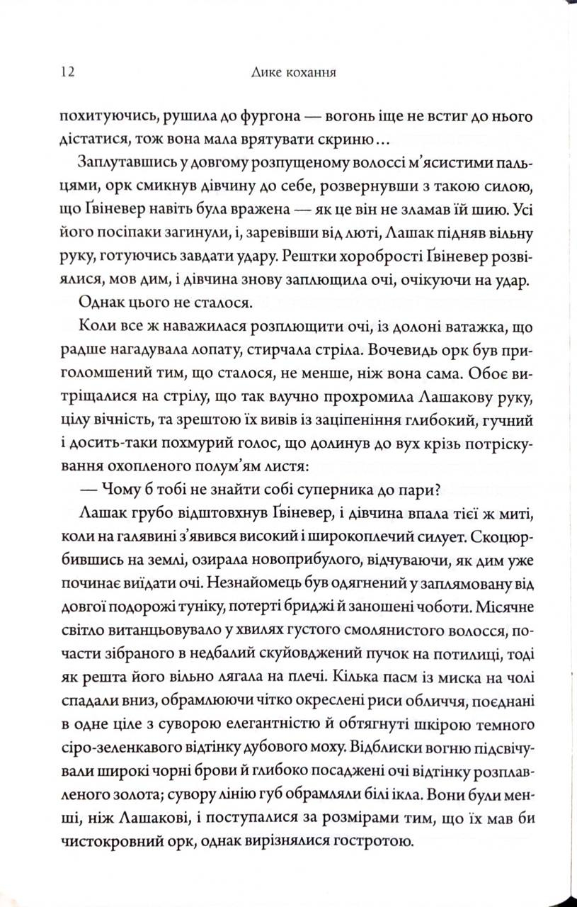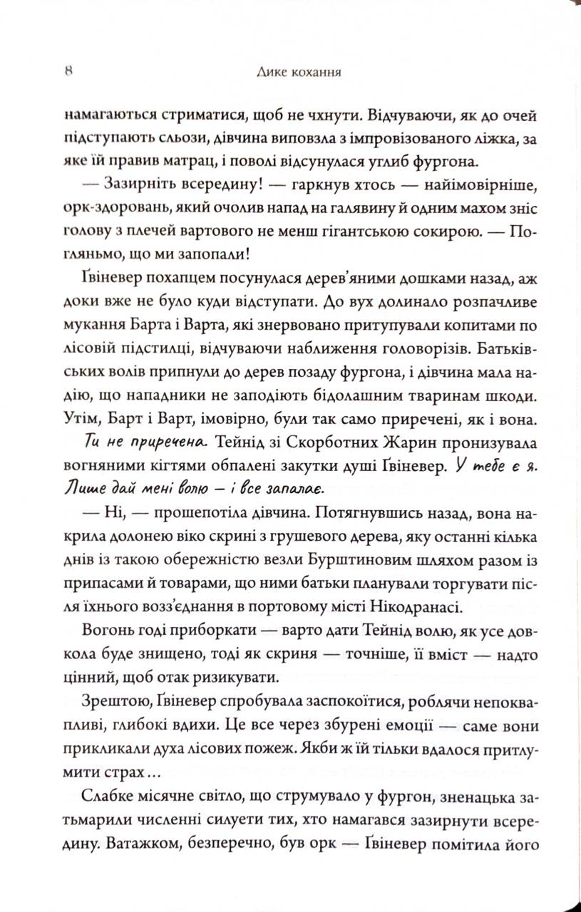 Дике кохання — це яскравий зразок сучасного романтичного фентезі від талановитої Теї Ґуанзон. Ґвіневер, донька заможного купця, завжди була лише пішаком у політичних іграх своєї родини. Її доля була вирішена наперед: шлюб із лордом Двендалійської імперії та роль покірної дружини. Проте в серці дівчини завжди жило непереборне прагнення до справжньої свободи. Життя Ґвіневер змінюється в одну мить, коли після кривавого нападу бандитів її рятує той, кого вона найменше очікувала побачити — похмурий відлюдькуватий напіворк на ім'я Оскар. Він має власну таємну місію в далеких землях, і тендітна аристократка лише заважає його планам. Проте шлях повний небезпек змушує цих двох об'єднатися, відкриваючи один в одному риси, які здатні розтопити кригу упереджень та запалити вогонь нестримної пристрасті.