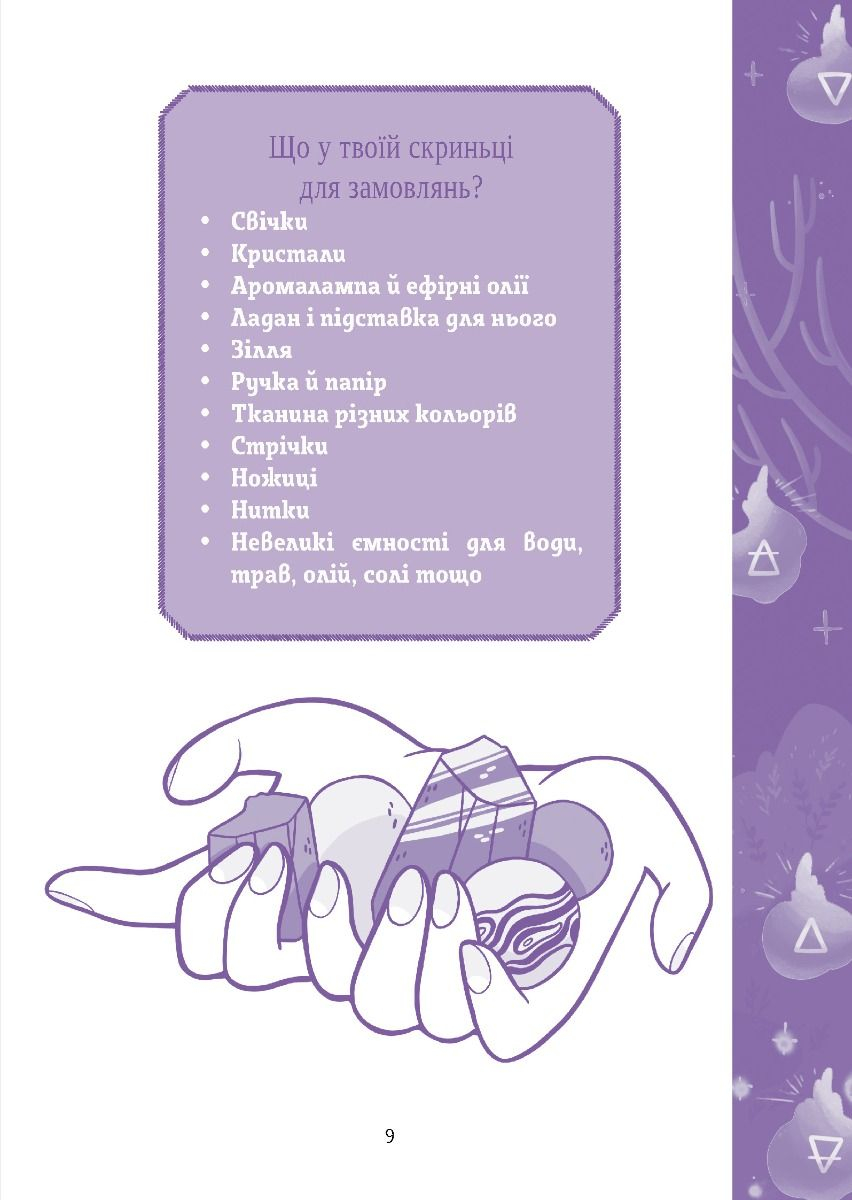 - Магічні інструменти: як правильно обирати та використовувати кристали, створювати цілющі зілля та готувати простір для ритуалів.