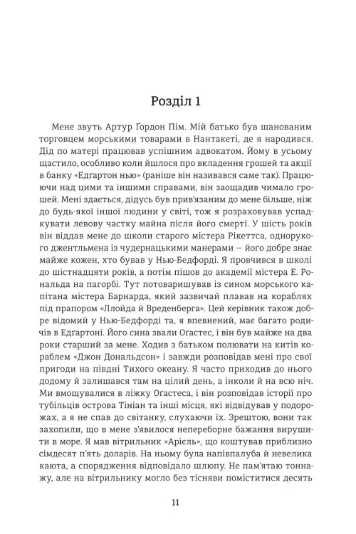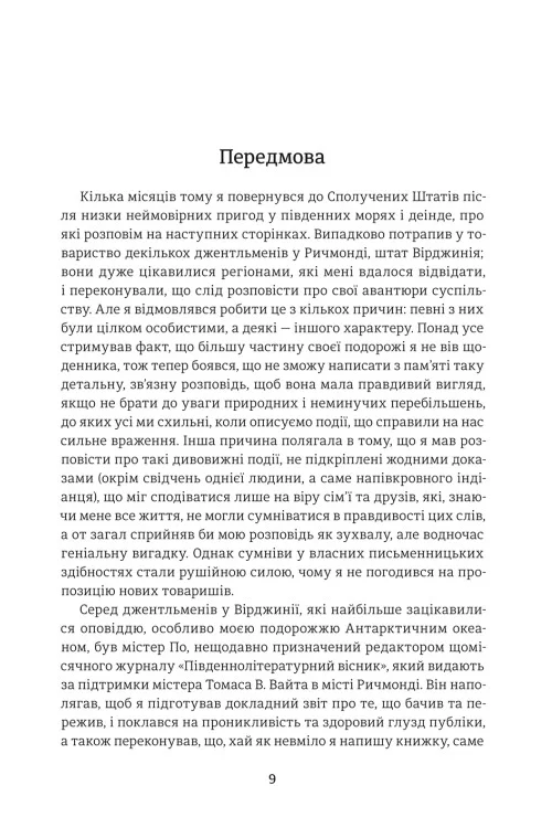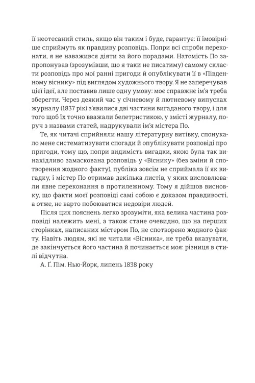 Оповідь Артура Ґордона Піма — це унікальний твір у доробку визнаного майстра жахів та детективу Едґара Аллана По. Починаючись як класична пригодницька історія про юнака, що таємно пробирається на борт китобійного судна, роман швидко перетворюється на сюрреалістичний кошмар. Артур Ґордон Пім стає свідком кривавого заколоту, витримує нищівні шторми, стикається з канібалізмом та голодом у відкритому океані. Проте справжні жахи чекають на героїв попереду — у загадкових південних землях Антарктики, де сама природа здається ворожою, а реальність починає викривлятися. Це історія про межі людської витривалості та про зіткнення з непізнаваним, яке назавжди змінило обличчя світової літератури.