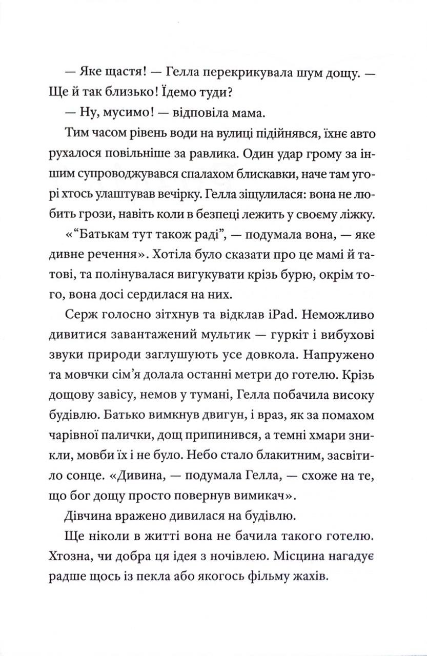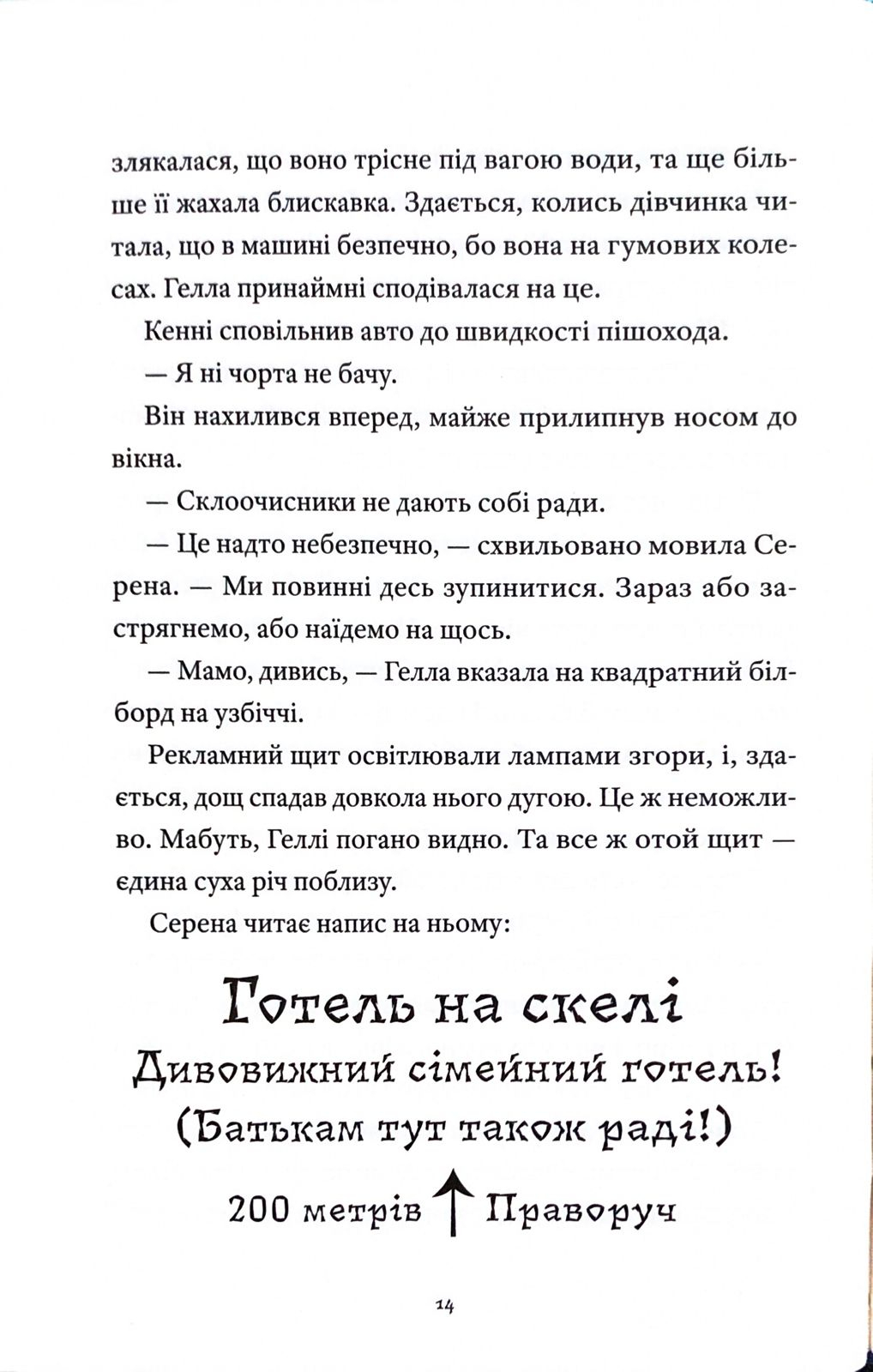 Готель на скелі — це неймовірна пригодницька повість від Мел Гартман, яка захоплює з перших сторінок і тримає в напрузі до самого кінця. Все починалося як звичайна поїздка на канікули: Гелла, її батьки та молодший братик шукають прихисток від негоди. Знайдений на скелі готель здавався ідеальним місцем для ночівлі, проте реальність виявилася куди дивовижнішою. Коли будівля раптово відірвалася від землі та злетіла в небо, а всі дорослі безслідно зникли, діти залишилися сам на сам із магією готелю. Тепер Геллі та іншим маленьким заручникам доведеться об'єднатися, щоб розгадати таємниці цього дивного місця, де кожен коридор веде до нових випробувань, а кожне необачно висловлене бажання може обернутися справжньою загрозою.