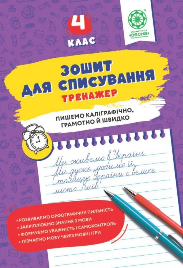 «Зошит для списування. Тренажер» спрямований на формування каліграфічного, грамотного й швидкого письма. Він допомагає закріпити знання з української мови, розвиває орфографічну пильність, уваж-