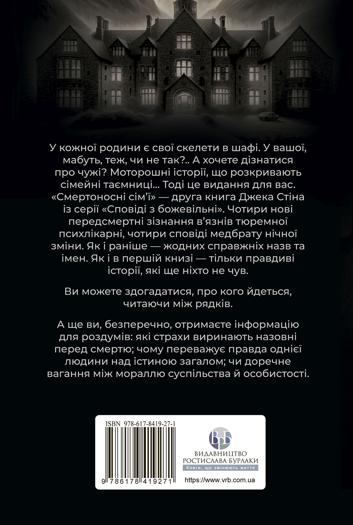 «Смертоносні сім’ї» — друга книга Джека Стіна із серії «Сповіді з божевільні». Чотири нові передсмертні зізнання в’язнів тюремної психлікарні, чотири сповіді медбрату нічної зміни. Як і раніше — жодних справжніх назв та імен. Як і в першій книзі — тільки правдиві історії, які ще ніхто не чув. Ви можете здогадатися, про кого йдеться, читаючи між рядків.