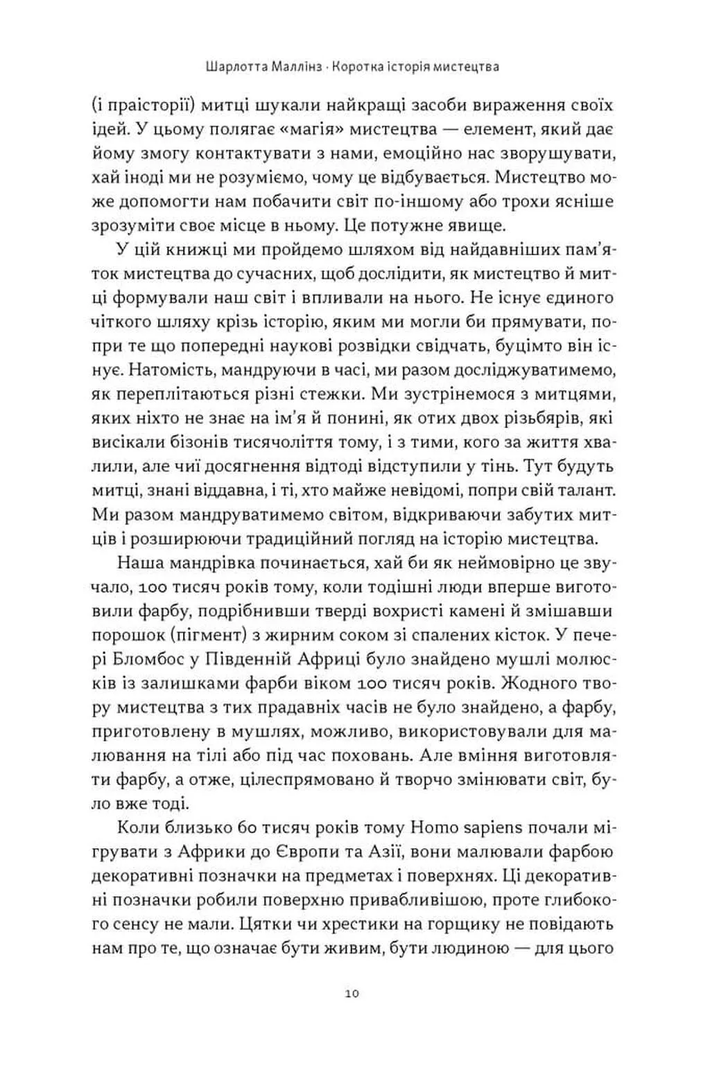 Коротка історія мистецтва — це фундаментальна та водночас неймовірно динамічна праця відомої мистецтвознавиці Шарлотти Маллінз. Авторка запрошує читачів у подорож, що охоплює сто тисяч років: від перших відбитків долонь на скелях до сучасних відеокліпів, що переписують історію в стінах Лувру. Книга дає відповіді на питання, які часто ставлять собі відвідувачі галерей: що змушувало первісних людей малювати на стінах печер? Чому античні статуї викликали такий захват, а звичайний пісуар у ХХ столітті став революційним твором мистецтва? Маллінз не лише аналізує загальновідомі шедеври, а й відновлює справедливість, повертаючи в культурний контекст імена талановитих мисткинь та представників різних культур, які довгий час залишалися в тіні «традиційної» історії.