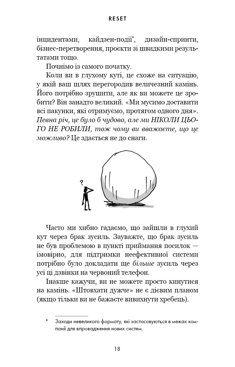 Часом лише одна непрацююча деталь заважає успішно функціонувати усьому механізму. Як визначити «слабку ланку» в роботі компанії, організації чи навіть у повсякденному житті? Як провести «ремонт» так, аби не зупиняти процесу роботи? Як припинити боротися з вітряками й точно визначити, куди докладати зусилля, щоб зробити бізнес ефективнішим? Ден Хіт, автор бестселерів із бізнесу, у своїй новій книзі пропонує стратегію, яка допоможе зрушити камінь «стабільності», що зупиняє ваш розвиток, знайти точки впливу, на які можна натиснути з невеликим зусиллям і отримати велику віддачу, а також пояснює, чому часом очевидно ефективні речі не працюють, а неефективні приносять колосальні результати.