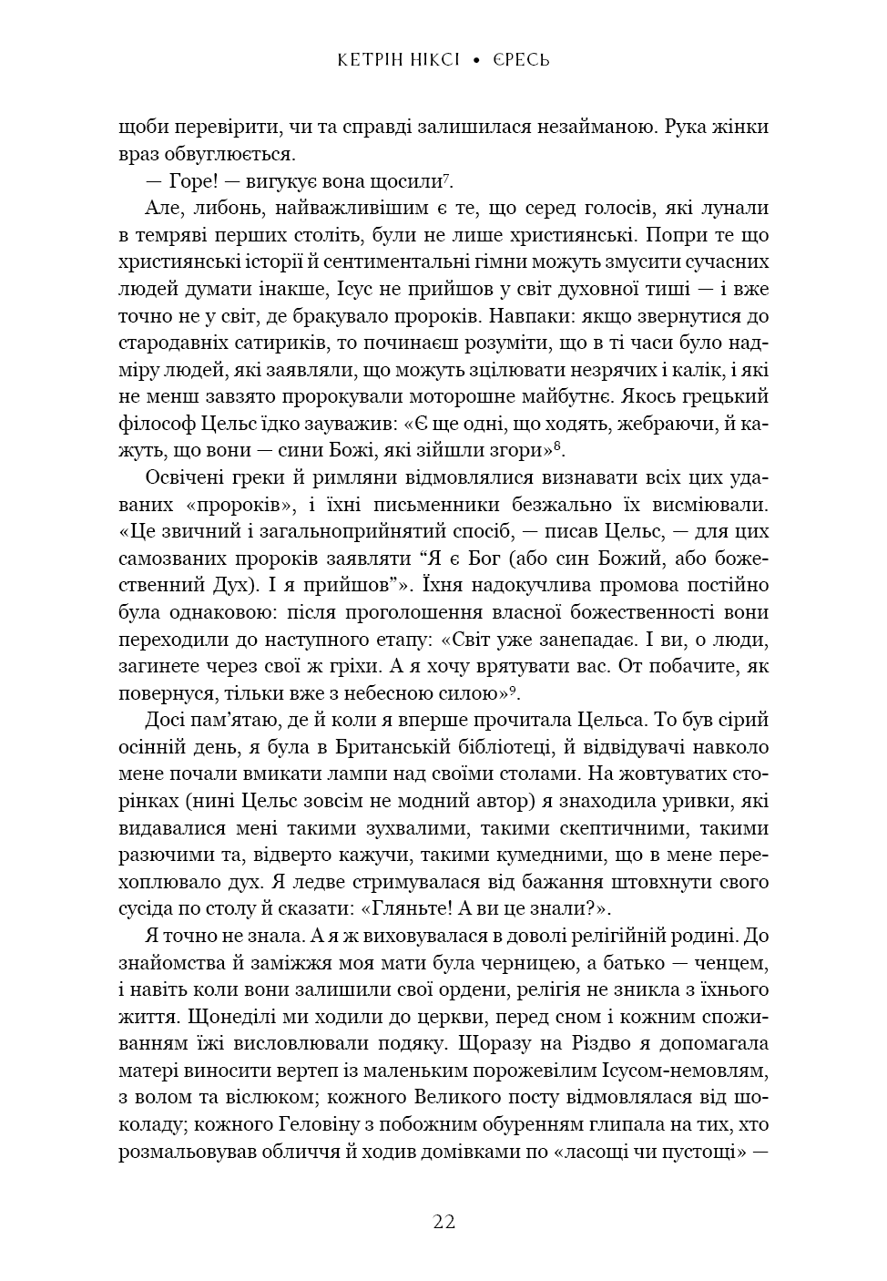 Всупереч ученням сучасної церкви, у перші кілька століть існування християнства не існувало єдиної думки щодо того, ким був Ісус і чому він мав значення. Натомість було багато різних месій. Один Христос мав брата-близнюка й подорожував до Індії; інший спілкувався з драконами. Ще один, особливо жахливий, Христос зневажав своїх батьків і вбивав тих, хто йому противився. Крім того, в перші роки I тисячоліття було багато інших рятівників людства, багато синів богів, які зцілювали хворих і ставили на ноги лежачих. Але з поширенням християнства їх визнали неприйнятними, навіть єретичними, і вони зникли з поля зору. Книга «Єресь» пропонує ознайомитися з різними версіями Христа, які існували в ранніх християн, і з процесом еволюції та знищення «зайвих», завдяки якому Ісус став єдиною значущою постаттю християнства, яку ми знаємо сьогодні.