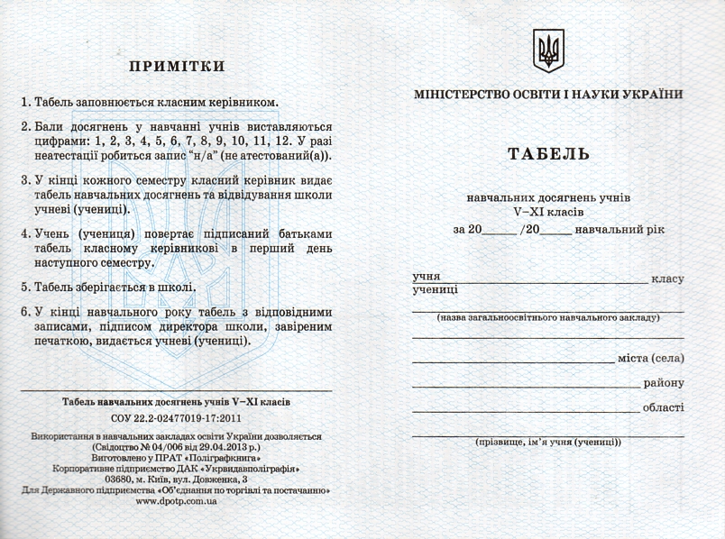 Табель навчальних досягнень учнів 5-11класів