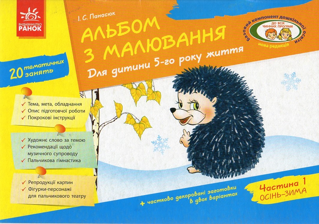 Навчальний посібник І. С. Панасюк «Альбом з малювання. Для дитини 5-го року життя. Частина 1» містить 18 тематичних занять, розроблених відповідно до вимог нової редакції Базового компоненту дошкільної освіти та чинних программ.